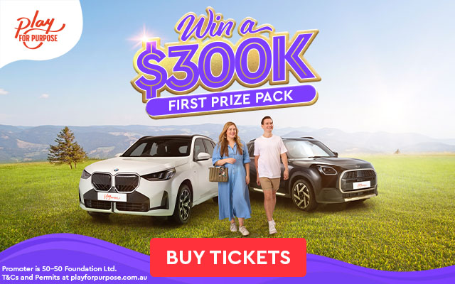 Along with our generous supporters, Play for Purpose has raised over $10 million for good causes. These funds have helped hundreds of good causes across Australia including mental health, homelessness, animal welfare and more. Together we can make a difference and give yourself a chance to win the $300,000 First Prize Pack with a $10 ticket now!